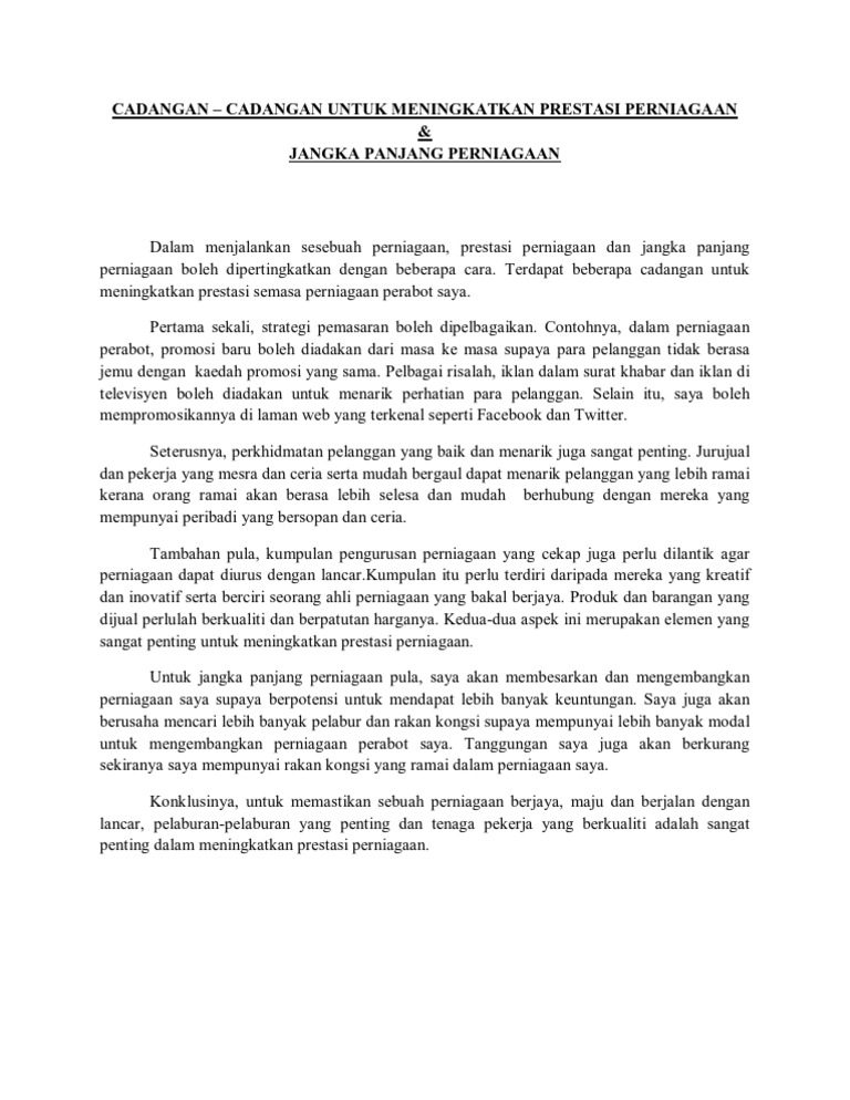 Cadangan Untuk Meningkatkan Prestasi Semasa Dan Jangka Panjang Perniagaan Pdf